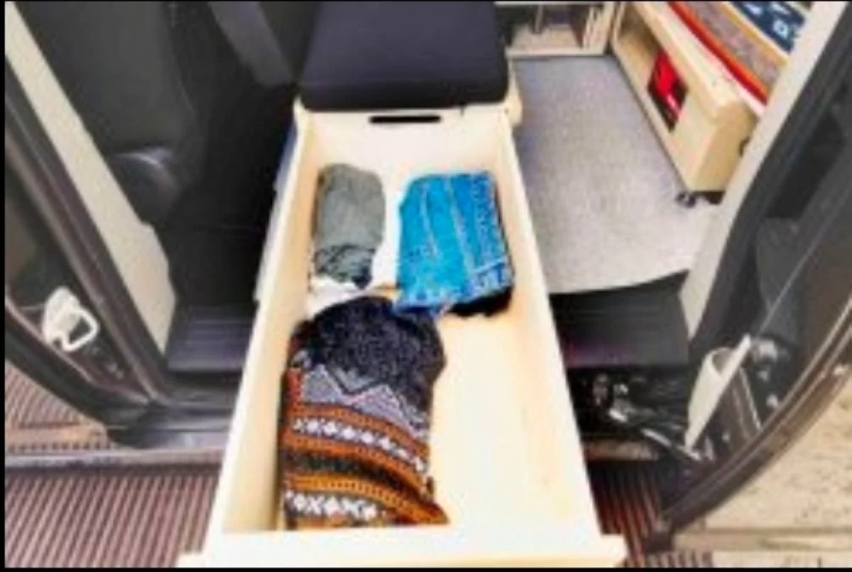 The drawers slide smoothly and stay closed on the road, which sounds like a low bar but matters when you're navigating bumpy terrain. Roadloft's design minimizes hardware specifically to reduce the risk of rust and breakage from road vibrations — a detail that reflects how much thought went into this for people actually living in their vehicles full-time.